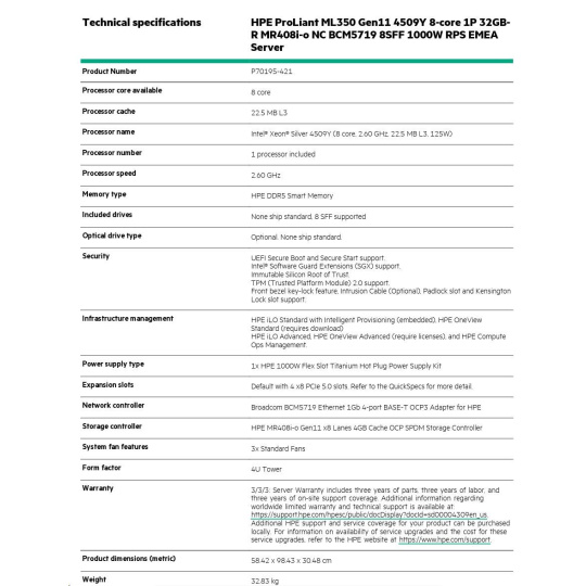 | SKU Number | P70195-421: HPE ProLiant ML350 Gen11 4509Y 8-core 1P 32GB-R MR408i-o NC BCM5719 8SFF 1000W RPS EMEA Server |