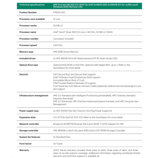 Model Name HPE PL ML350g11 4510 (2.4G/12C) 2x32G 2x960G 2x1000W MR408i-o 8-24SFFU3