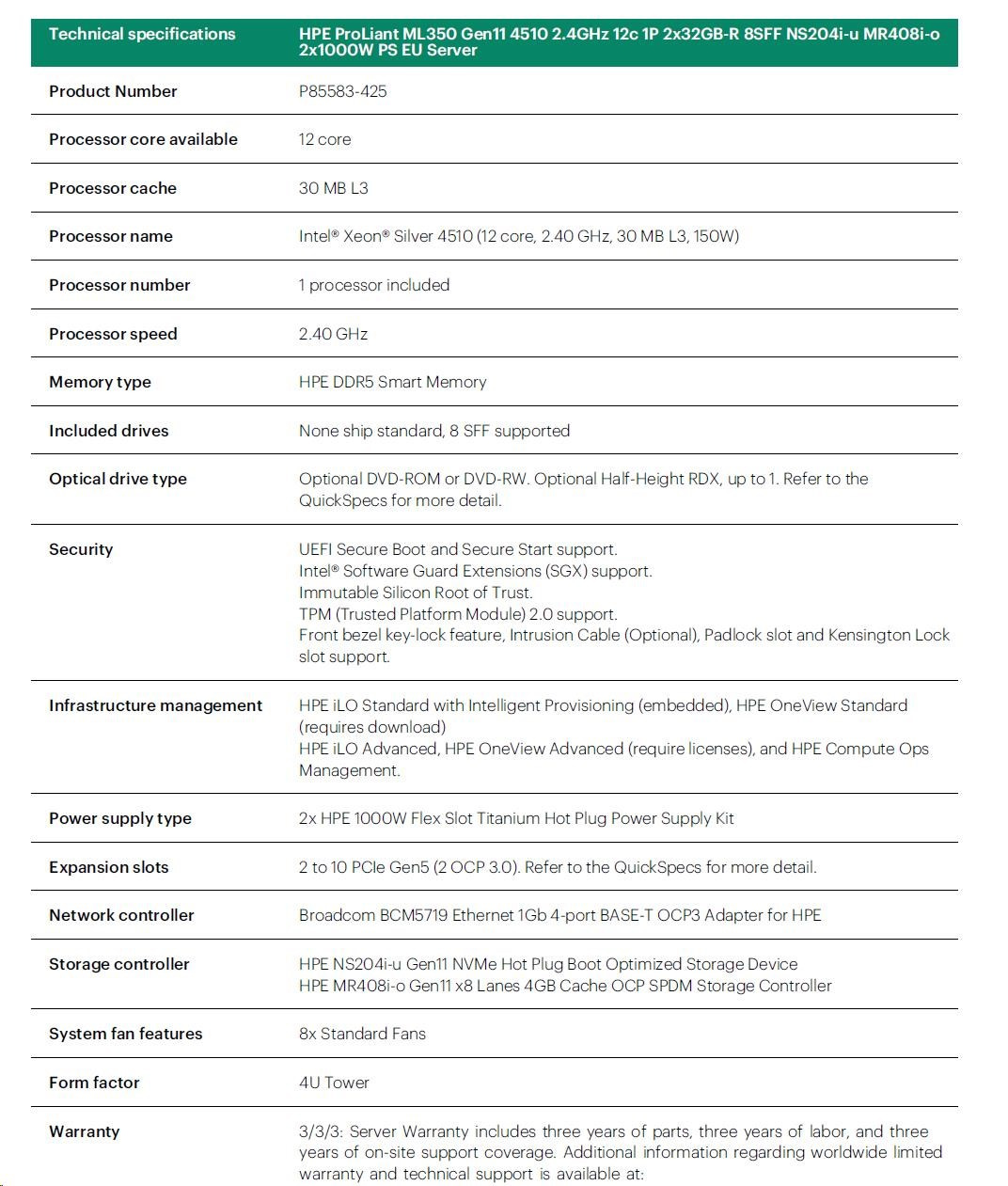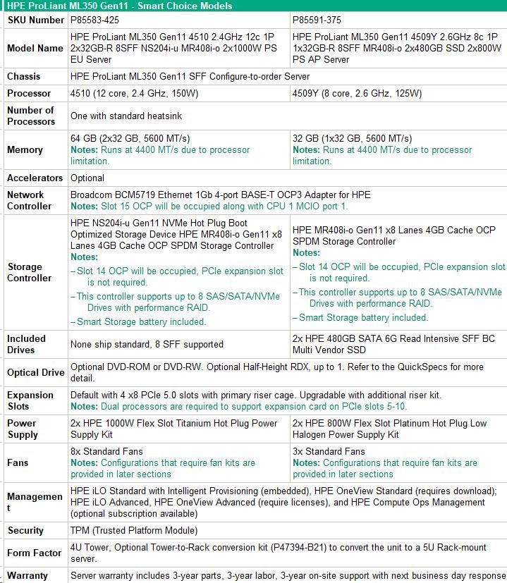 HPE PL ML350g11 4510 (2.4G/12C) 2x32G (P64706) NS204(2x480) MR408i-o 2x1000W 8SFF 4p1Gb 8fans Smart Choice