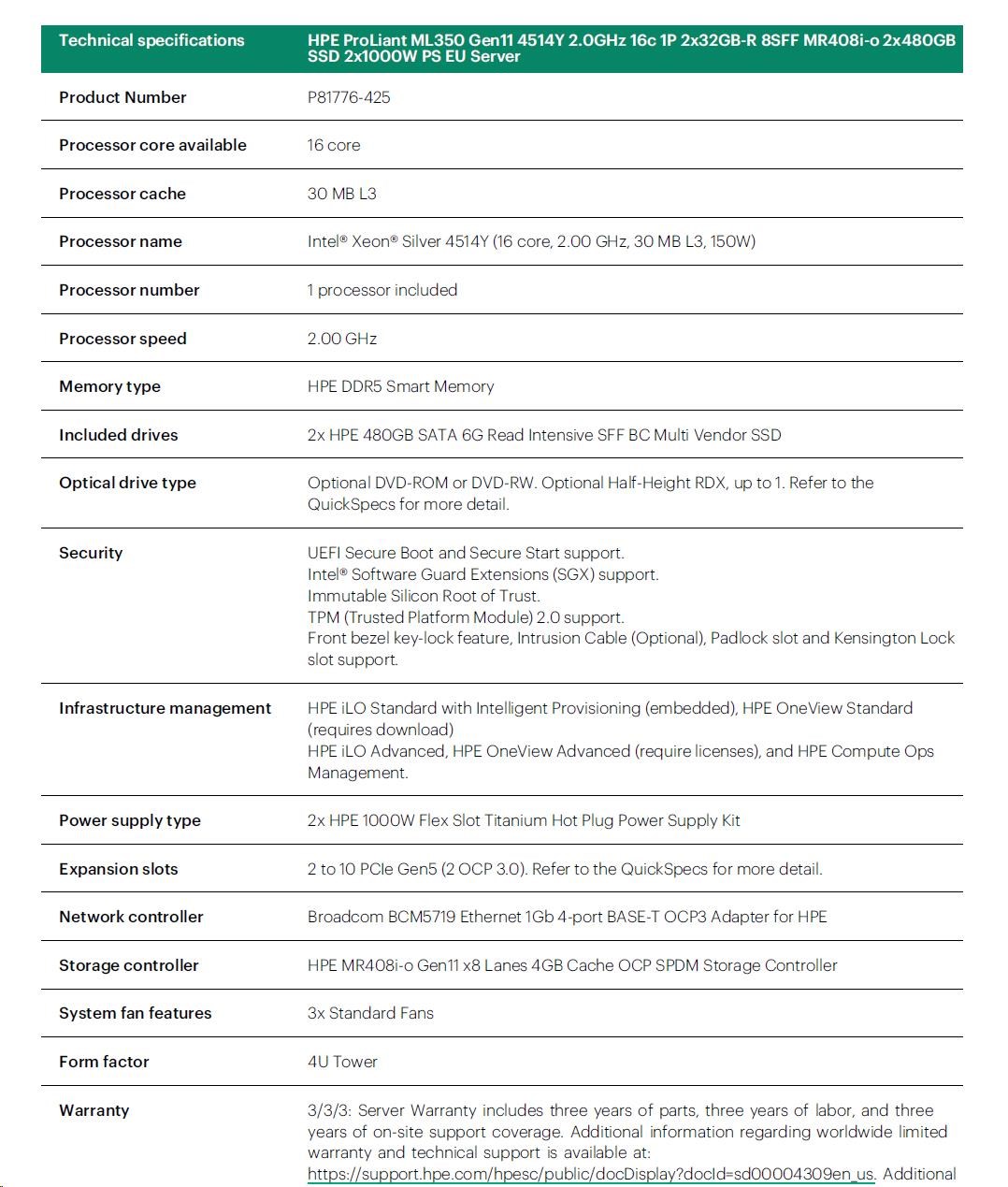 HPE ProLiant ML350 Gen11 4514Y 2.0GHz 16c 1P 2x32GB-R 8SFF MR408i-o 2x480GB SSD 2x1000W PS EU Server