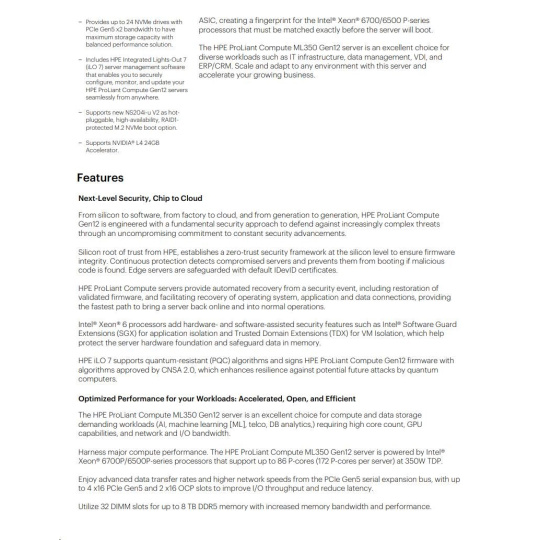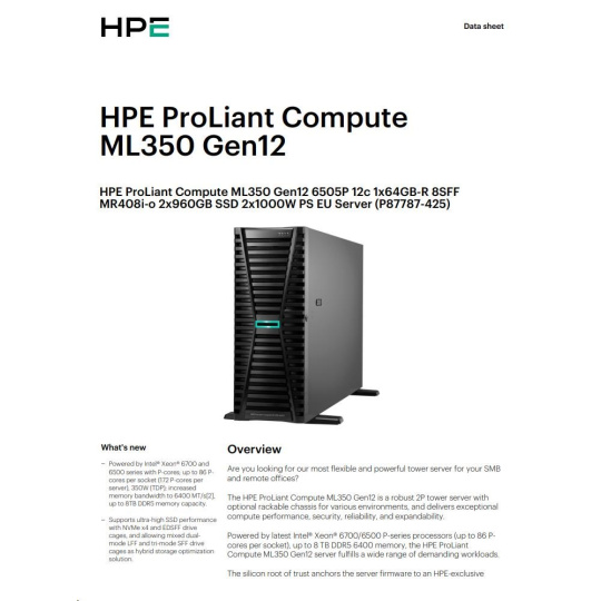 HPE PL ML350g12 6505P (2.2/12C) 1x32G (P69728) 2x4TB 4LFF MR408i-o2x1000W 1GbE NBD333 Smart Choice.