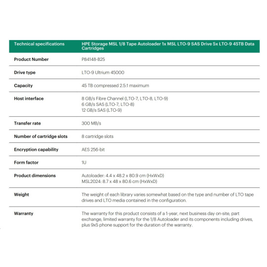 HPE Storage MSL 1/8 Tape Autoloader 1x MSL LTO-9 SAS Drive 5x LTO-9 45TB Data Cartridges