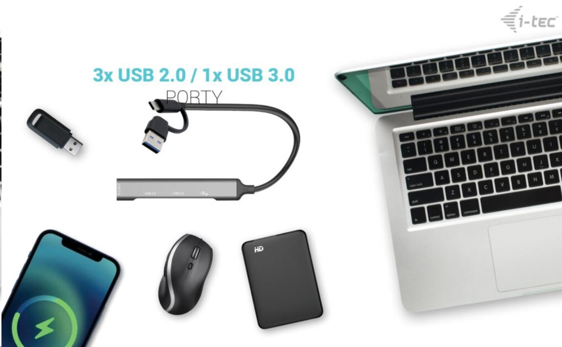 - Univerzálny pasívny HUB USB-C/USB-A umožňuje pripojiť až 4 zariadenia.