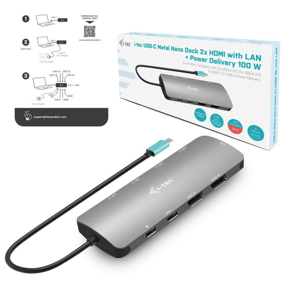 i-tec USB-C Metal Nano 2x HDMI Docking Station, PD 100W
