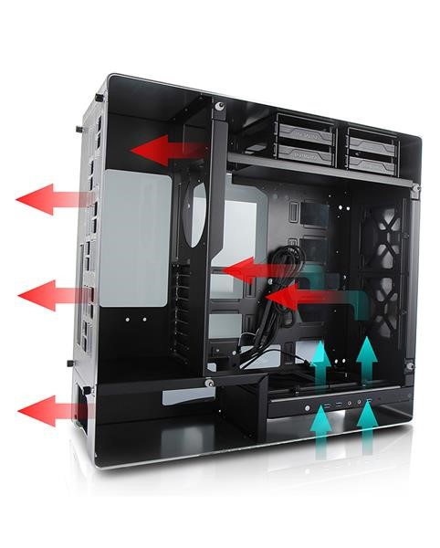 Oddelené pozície pre HDD a PSU zabezpečujú ideálne prúdenie vzduchu cez zadné vetracie otvory do vonkajšieho priestoru bez toho, aby teplému vzduchu bránili základné dosky alebo grafické karty.