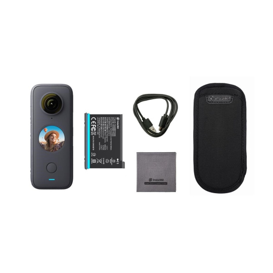 Akčná outdoorová 360 kamera Insta360 ONE X2, odolná konštrukcia, vodotesná do 10 m, dvojica 360° objektívov s celkovým rozlíšením 5,7K a 30 fps, kodek H.265, dotykový displej, štyri mikrofóny pre 360 audio, automatické strihanie a úpravy v mobilnej aplikácii Insta360 ONE, ShotLab, SteadyCam režim, stabilizácia FlowState, ovládanie hlasom. 80 minút nahrávania. Hmotnosť 149 g, 46,2 x 113 x 29,8 mm.