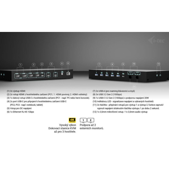 i-tec USB-C KVM Docking station for 3 Hosts, Dual Display, Power Delivery 1x 92W/2x 65W