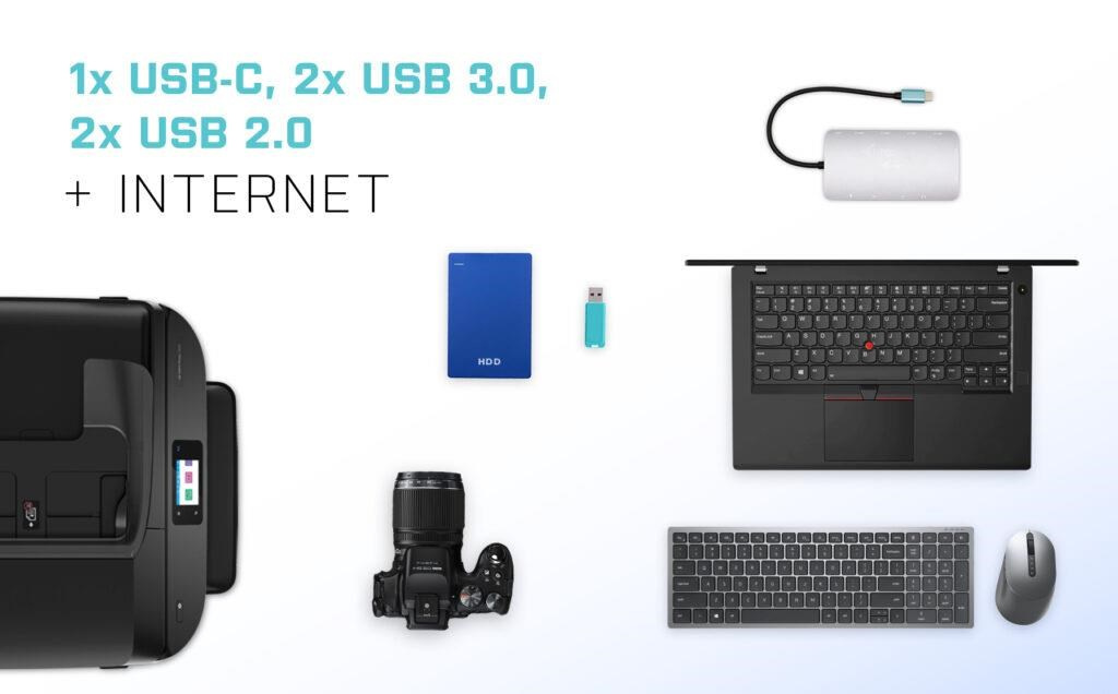 - 2x USB 3.0, 2x USB 2.0 a 1 port USB-C vám umožní jednoducho pripojiť zariadenia USB a periférne zariadenia.