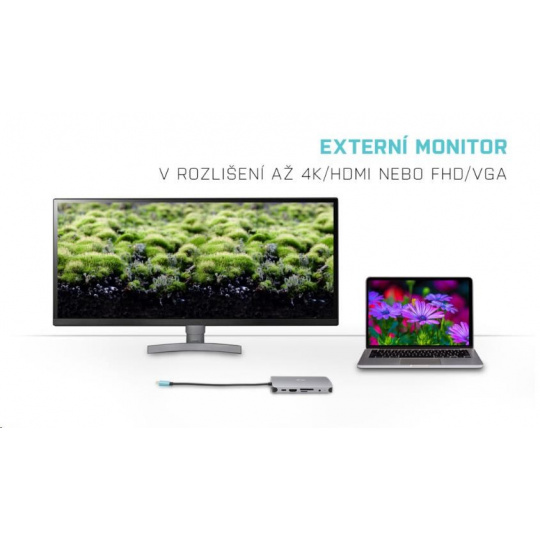 Malá kovová dokovacia stanica USB-C, ku ktorej môžete ľahko pripojiť externý monitor alebo projektor cez port HDMI alebo VGA. Stačí pripojiť notebook alebo tablet (bez potreby ovládačov) a využiť rýchle dátové pripojenie USB, pripojenie k internetu cez port LAN a možnosť pripojiť slúchadlá a mikrofón. Samozrejme, podporuje napájanie notebooku až do 100 W, čo znamená, že budete môcť nabíjať všetky notebooky a tablety, ktoré podporujú nabíjanie cez USB-C (USB-C Power Delivery).
