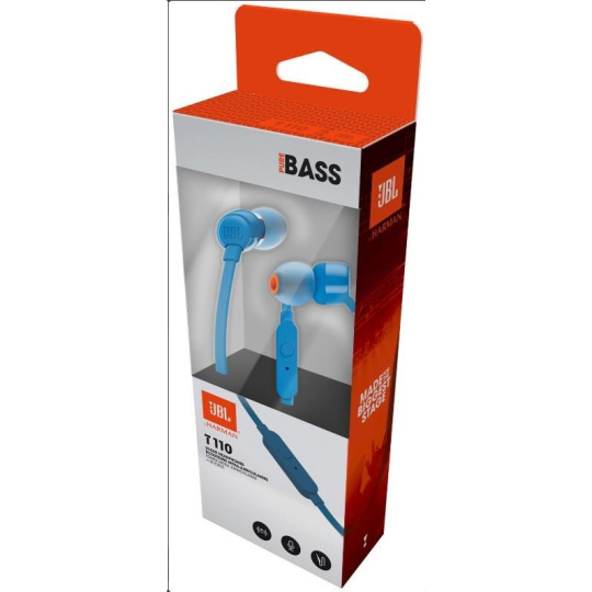 JBL T110 Black špuntová sluchátka, 3,5 mm jack, mikrofon, modrá