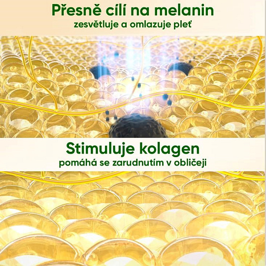 - Režim WHITEN (Bielenie škvŕn): Cielene sa zameriava na tmavé pigmentové škvrny, pihy a stopy po akné. Energia je pohltená nahromadeným melanínom, ktorý sa teplom rozloží na menšie častice a telo je následne prirodzene odbúrané. Škvŕny tak postupne blednú a sú menej viditeľné.