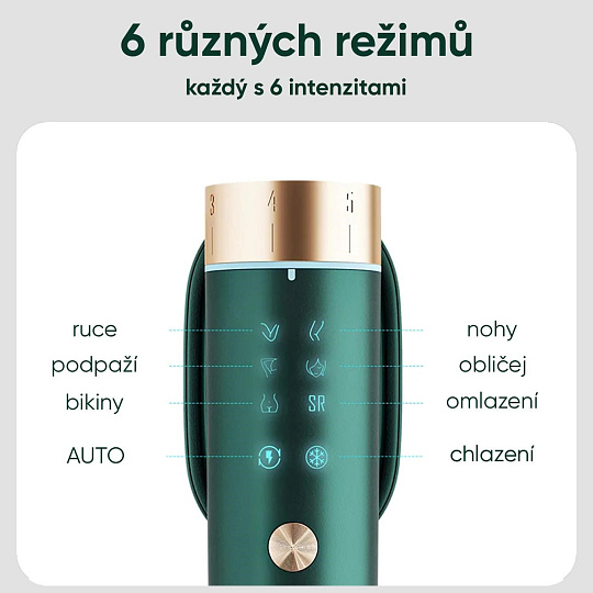 - Presné cielenie na každú partiu: 6 špecializovaných režimov pre tvár, ruky, nohy, podpazušie a oblasť bikín s 6 úrovňami intenzity.