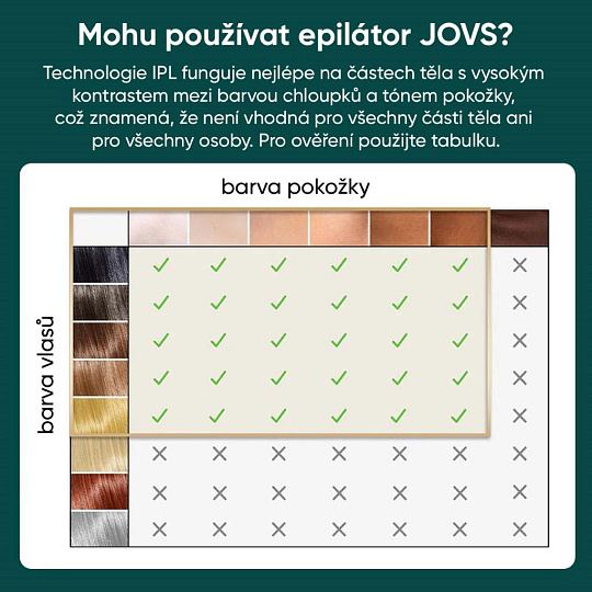 *Toto zariadenie môže používať ktokoľvek s typmi pleti I až V na Fitzpatrickovej stupnici. Ak máte veľmi tmavý odtieň pleti (typ VI), toto zariadenie prosím nepoužívajte. JOVS Pro II je možné použiť na ošetrenie tmavých blond až čiernych typov chlpu, ale nie na svetlé blond, zrzavé alebo šedivé chlpy.