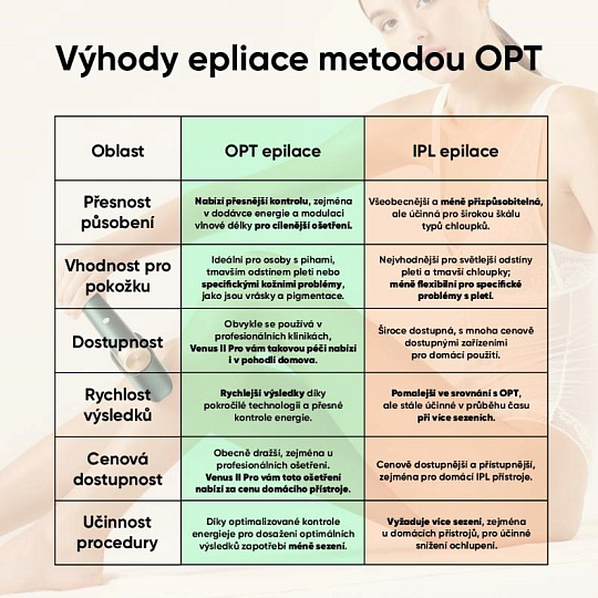 - O 60 % vyššia účinnosť: Využíva pokročilú technológiu OPT (Optimal Pulse Technology), ktorá je účinnejšia ako tradičné IPL.