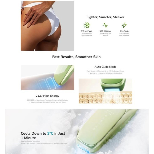 - Revolučné chladenie na 10 °C: Pokročilá chladivá technológia zaručuje naprosto bezbolestné a komfortné ošetrenie bez pálenia a podráždenia.