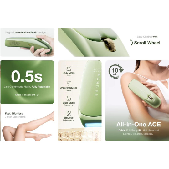 - Cielená starostlivosť pre celé telo: Niekoľko režimov a úrovní intenzity pre bezpečné ošetrenie nôh, rúk, podpazušia, oblasti bikín aj tváre.