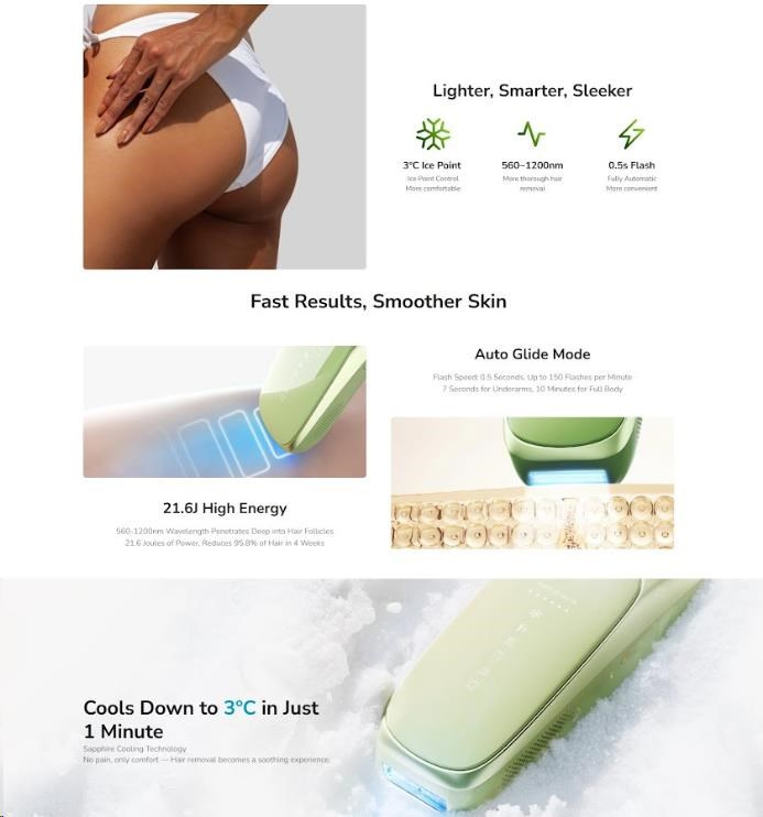 - Revolučné chladenie na 10 °C: Pokročilá chladivá technológia zaručuje naprosto bezbolestné a komfortné ošetrenie bez pálenia a podráždenia.