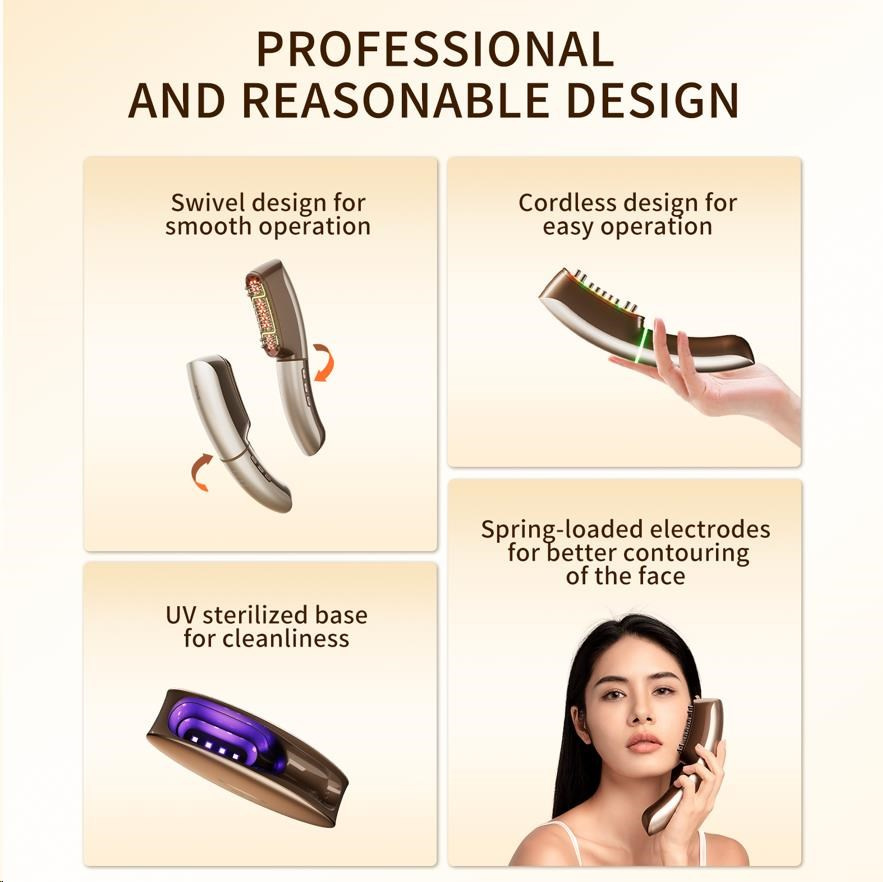 - Revolučná technológia CET: Unikátne elektrické pulzné vlny, ktoré pôsobia priamo na svalovú vrstvu pre maximálny liftingový efekt – oveľa účinnejšie než bežný EMS mikroprúd.