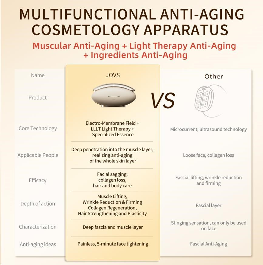 Väčšina kozmetických prístrojov sa zameriava len na dermis, teda na pokožku. Starnutie však začína hlbšie. Ak svaly pod kožou stratia svoju pevnosť, pokožka príde o svoju oporu a začne ochabovať a klesať – bez ohľadu na to, koľko kolagénu obsahuje. JOVS Slimax ako jediný využíva technológiu elektrických pulzných vĺn CET (Collagen Electrophoretic Techniques), ktorá vysiela signály priamo do svalovej vrstvy, stimuluje ich aktivitu a tým obnovuje pevný základ celej tváre.