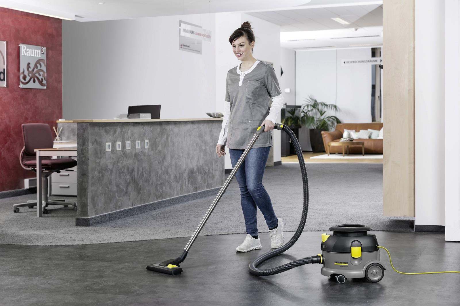 Odolný vysávač T 12/1 spoľahlivo odstráni odolnú špinu z kobercov aj tvrdých podláh. Pri vysávaní spôsobí minimum hluku (60 dB), takže je ideálny do hotelov, reštaurácií aj maloobchodu. Prístroj s príkonom 700 W vytvorí podtlak až 22 kPa, ktorému odolajú aj hrubé nečistoty. Dômyselný 6násobný filtračný systém zabezpečuje hygienické odstránenie prachu a dlhú výdrž vysokého sacieho výkonu. Omyvateľný filtračný kôš umožňuje vysávanie so sáčkom aj bez neho. Na požiadanie k vysávaču dodávame aj kvalitný HEPA filter pre ešte lepšie výsledky. Vysatý odpad sa ukladá do veľkej 12l nádoby odolnej voči nárazom. Komfort pri upratovaní zabezpečí dlhý 12m prívodný kábel a ergonomická rukoväť vysávača. Prístroj ľahko zapnete aj nohou a vďaka štvorici pogumovaných koliesok ho ľahko presuniete kamkoľvek je potrebné. A keď je všetko čisto lesklé, kábel, hubicu aj sacie trubky jednoducho upevníte ku telu vysávača, čím ušetríte miesto na uskladnenie.
