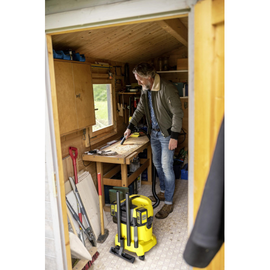Výkonný a prenosný: 36voltový motor vysávača na mokré a suché vysávanie WD 4-18 S Dual Battery je napájaný dvoma 18voltovými batériami, ktoré zabezpečujú výkonné satie a maximálnu voľnosť pohybu pri vysávaní. Akumulátorový vysávač na mokré a suché vysávanie je súčasťou 18V batériovej platformy Kärcher Battery Power a počas okamihu odstráni mokré, jemné aj hrubé nečistoty. Vysávač má robustnú 20litrovú plastovú nádobu, 2,2metrovú saciu hadicu, klipovú podlahovú hubicu, vláknový filtračný vrecúško a praktický plochý sklápací filter, ktorý je vhodný pre nepretržité mokré a suché vysávanie bez nutnosti výmeny filtra. Vďaka patentovanej technológii vyberania možno filter vytiahnuť a vyčistiť počas niekoľkých sekúnd - bez kontaktu s nečistotami. Tam, kde nie je možné vysávať, prichádza na slovo funkcia fúkača. Úložisko saciej hadice šetrí miesto - jednoducho ju bezpečne zavesíte na hlavu prístroja. Rúry a podlahová hubica sa tiež rýchlo a pohodlne uloží na nárazník. K ďalším funkciám patrí ergonomická rukoväť pre prenášanie a uzávery systém „Pull & Push“ pre jednoduché otváranie a zatváranie nádoby. Batéria a nabíjačka sú súčasťou balenia.
