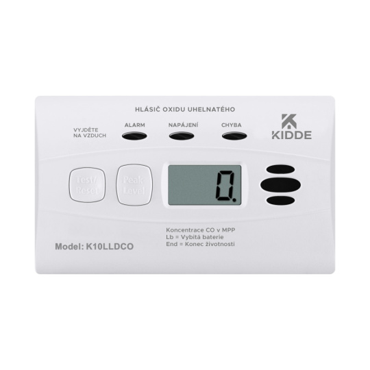 Detektor oxidu uhoľnatého (CO) Kidde K10LLDCO neustále monitoruje prítomnosť jedovacieho oxidu uhoľnatého v domácnostiach alebo prevádzkach, a tak poskytuje ochranu pred jeho smrteľnými účinkami. Okrem trojice kontrolných LED indikátorov disponuje tiež LCD displejom, na ktorom priebežne zobrazuje namerané hodnoty CO a ďalšie stavové informácie. Hlásič možno pevne nainštalovať na stenu alebo pre lepšie pohodlie jednoducho položiť na stôl, poličku alebo iný vodorovný povrch. Je ideálnym bezpečnostným prvkom a spoľahlivou ochranou pred týmto tichým zabijakom nielen pre domácnosti, ale aj v prenajatých ubytovacích priestoroch a ďalších objektoch. Schválením zodpovedá najnovším normám ČSN -EN50291:2018 pre domáce detektory oxidu uhoľnatého.