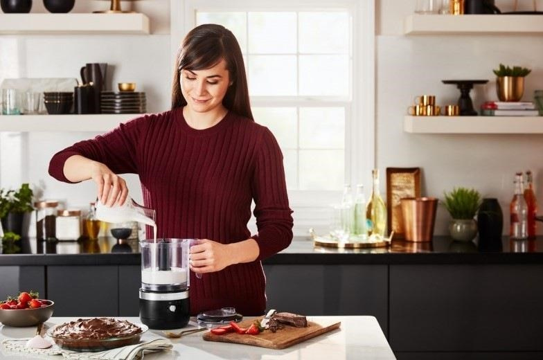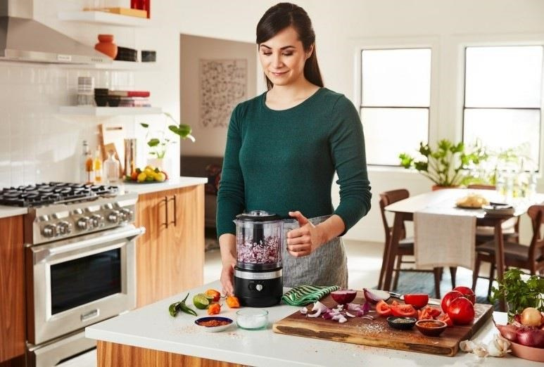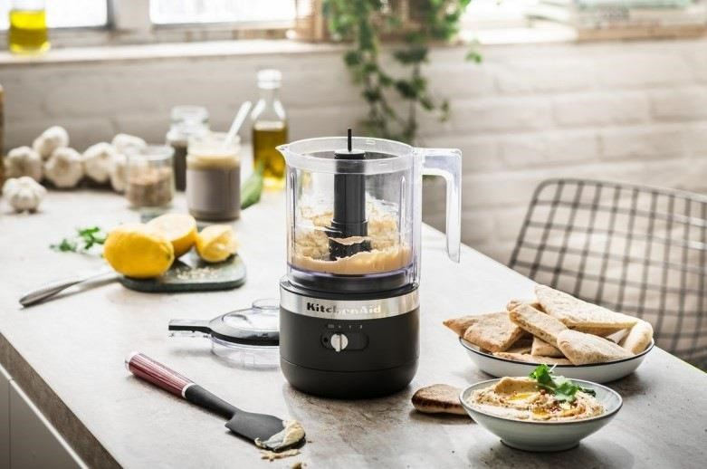 Hľadáte praktického pomocníka do vašej kuchyne? Vsaďte na poctivú prípravu, ktorá vedie k tým najlepším a najchutnejším výsledkom. Kuchynský robot KitchenAid 5KFCB519EBM je bezdrôtový model food processoru, ktorý sa stane nepostrádateľnou súčasťou vašej kuchyne. Zrýchli a zefektívni tie činnosti, ktoré pri príprave jedál zabíjajú veľa času. Pracovná nádoba o objemu 1,18 l je opatrená vekom s otvorom, ktorým možno postupne pridávať ingrediencie bez nutnosti zastavenia prevádzky. Požadovaných výsledkov dosiahnete vďaka dvom rýchlostiam a pulznej funkcii, počet otáčok je v rozmedzí 2 600 až 3 500 ot./min. Veľkou prednosťou food processoru sú tiež kompaktné rozmery a nízka hmotnosť, predstavuje perfektné riešenie aj do malých domácností. Ak chcete voľne tvoriť bez obmedzovania prívodným kábla, je pre vás táto pomocná sila ako stvorená.