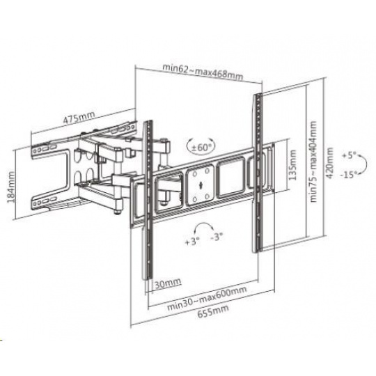 Kvalitný nástenný držiak na televíziu Fiber Mounts Solid-2 Otočný, sklopný, výsuvný držiak Tv 43-85" s pevnou a bezpečnou konštrukciou Držiak vhodný na zavesenie televízie na stenu do obývačky, izby alebo kancelárie. Držiak Tv Fiber Mounts Solid-2 sa vyznačuje kvalitnou robustnou konštrukciou s veľkou nástennou plochou pre spoľahlivú inštaláciu a umožňuje pomerne jednoduchú úpravu polohy televízie otáčaním do strán, naklápaním a vysúvaním alebo naopak priskrutkovaním ku stene. V prípade nerovností alebo nepresnej inštalácie umožňuje držiak korigovať rovinu obrazovky. Na držiak Solid-2 môžete zavesiť všetky televízory s hmotnosťou do 40kg, ktoré majú VESA od 100x100 do 600x400 – ideálne sú televízory s uhlopriečkou 43" až 85". Farebné prevedenie čierne, záruka 5 rokov. Držiak na televízor, ktorý vynikne skutočne solidnou pevnou konštrukciou - otáčanie Tv do strán, naklápanie, vysúvanie od steny - Fiber Mounts Solid-2 Technické údaje: nosnosť 40kg podpora VESA štandardov 100x100 až 600x400 ideálne na Tv s uhlopriečkou 43" až 85" polohovanie vzdialenosti od steny od 62mm do 468mm otáčanie televízora do strán +/- 60° naklápanie televízora smerom nadol až o 15° a nahor až o 5° úprava roviny obrazovky +/- 3° úchyty na káble robustná, spoľahlivá a bezpečná konštrukcia ľahké zavedenie televízora na stenu ľahké polohovanie televízora ľahká inštalácia na stenu dodávame vrátane inštalačného materiálu farebné prevedenie čierne záruka 5 rokov Oceľový nástenný držiak poctivej konštrukcie Fiber Mounts Solid-2 Televízia držiak Fiber Mounts Solid-2 podporuje VESA štandardy: VESA 100x100 VESA 100x200 VESA 200x100 VESA 200x200 VESA 200x300 VESA 200x400 VESA 300x200 VESA 300x300 VESA 400x200 VESA 400x400 VESA 600x400
