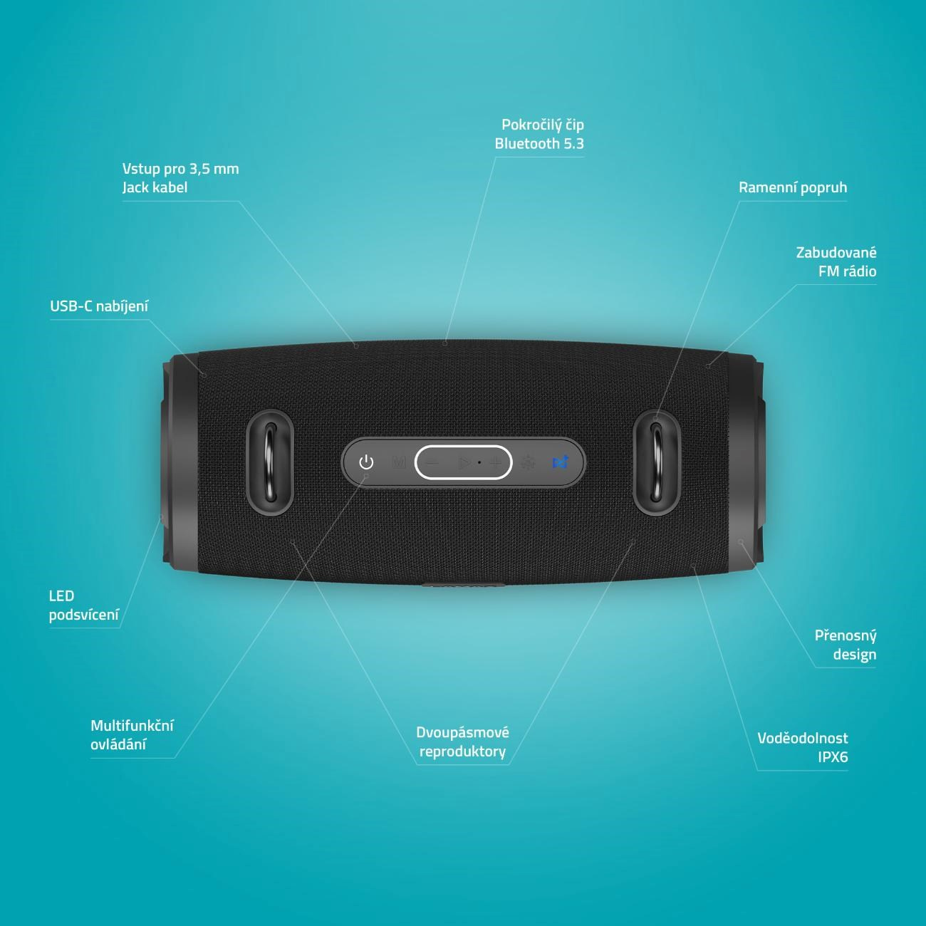 Minimalistický, ale moderný a vychytaný design repráku s LED podsvietením upúta na prvý pohľad a je škoda schovávať ho doma. Pridali sme preto ergonomický popruh pre ľahký prenášanie, nech si svojho parťáka môžeš brať kamkoľvek so sebou. Keď zmoknete, nič sa nedeje, vodeodolnosť IPX6 má vodu pod kontrolou. A ak by ťa trápilo, že budeš musieť študovať návod, tak klídek, tu je ovládanie tak jednoduché a intuitívne, že ho zvládne aj decko.