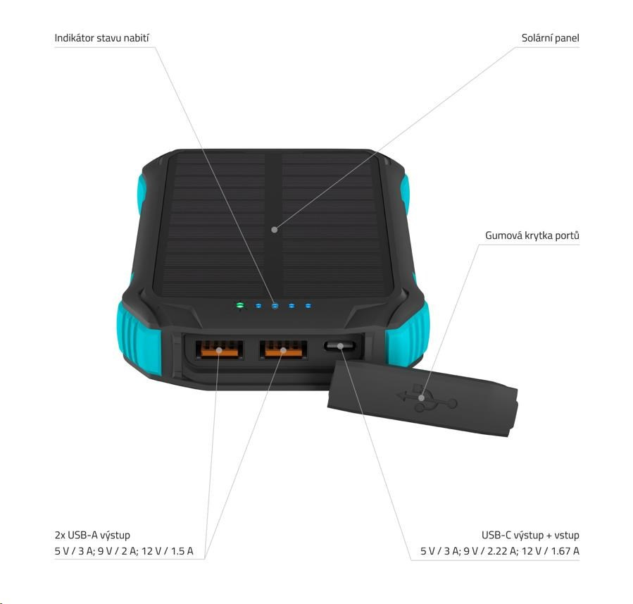Vďaka USB-A + USB-C výstupu môžeš nabíjať ďalšie zariadenie skoro akýmkoľvek káblom, čo máš po ruke. Kábel USB-A -> USB-C navyše dostaneš v balení.