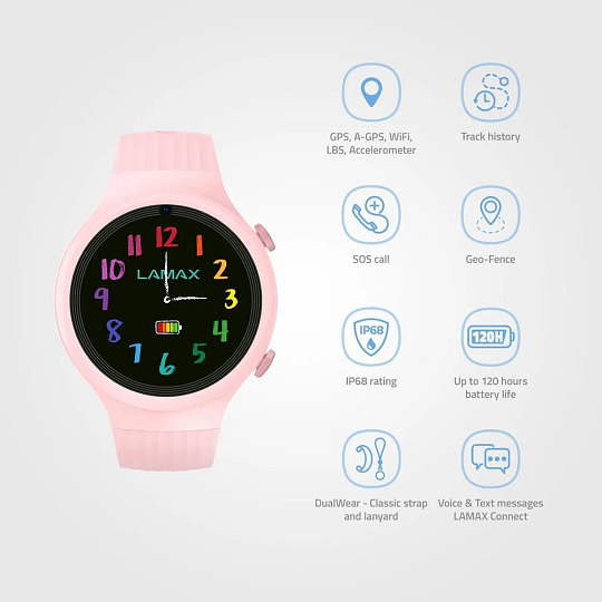 Dětské GPS hodinky, hlasové a textové zprávy, videohovory, určování polohy PinPoint®, bezpečnostní zóny, DualWear®, SOS tlačítko, funkce FriendsConnect® - propojení až 60 kamarádů, propojení všech členů rodiny díky FamilyCareConnect®, aplikace LAMAX Connect v češtině, šifrované spojení, výdrž až 120 hodin, krokoměr, připomínky, voděodolné, 1,2'' barevný dotykový displej s Gorilla Glass, SIM karta 200MB v balení