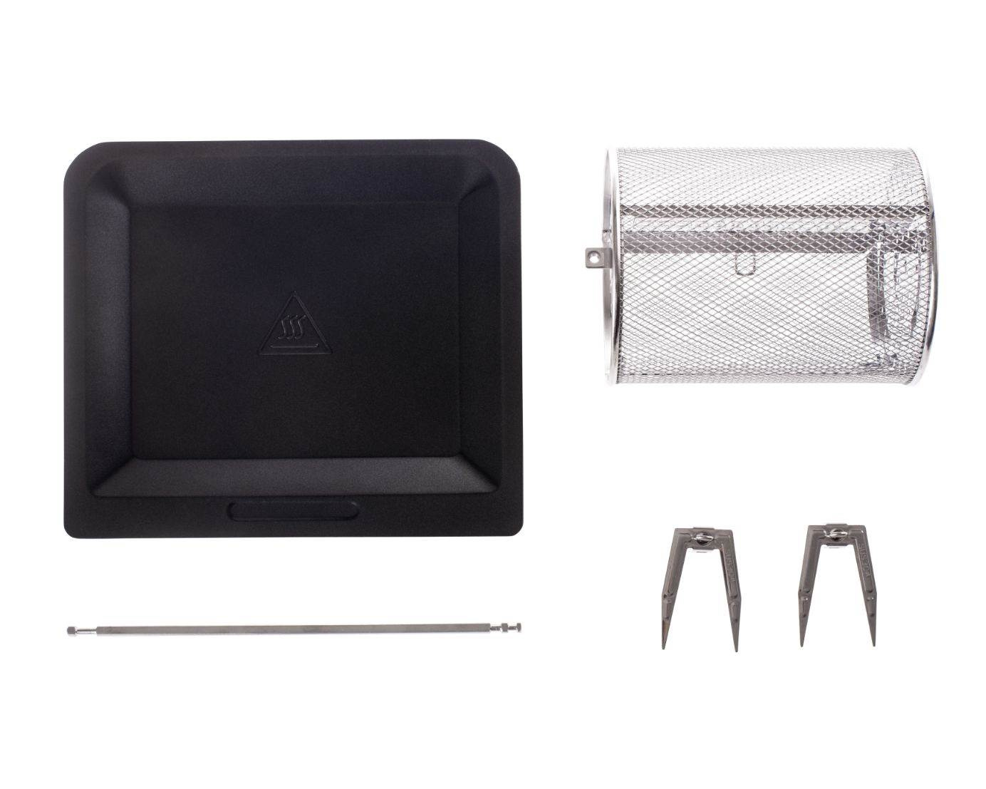 1 klasická mriežka na plech alebo rôzne formy, 1 rotačný kôš na hranolky, 1 hlbšia mriežka na pečenie kuracích krídiel, zemiakov, 1 plochá mriežka na sušenie ovocia či hríbov, 1 odkvapkávací plech, ktorý zachytáva tuk a olej, ihla na grilovanie celého kuraťa, úchyt.