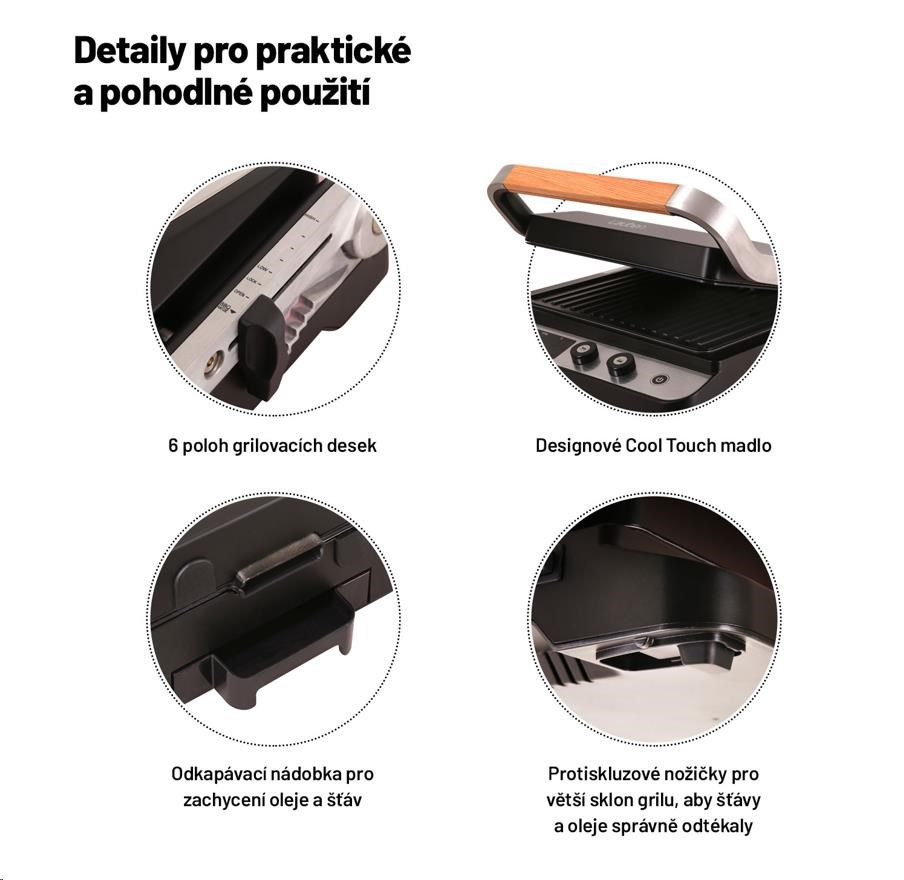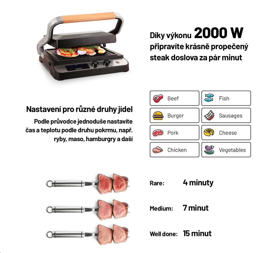 Gril vďaka výkonu 2000 W sa veľmi rýchlo zohrieva a poradí si aj so steakmi, ktoré vyžadujú prudké opečenie pri vysokej teplote.