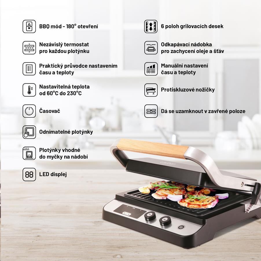 Platničky grilu majú nastaviteľnú polohu. Môžete napríklad upraviť výšku a sklon platničky tak, aby sa znížil tlak pôsobiaci na krehké suroviny, ako sú napríklad čerstvé ryby. V BBQ móde si pri každej platničke môžete nastaviť požadovanú teplotu ohrevu samostatne. S správnou voľbou teploty pre jednotlivé druhy potravín vám pomôže príložený sprievodca. Zároveň si pre každý pokrm môžete nastaviť požadovaný čas prípravy, takže sa nemusíte báť, že netrafíte správny stupeň prepečenia. Gril je vybavený funkciou automatického vypnutia, vďaka vysokému výkonu sa veľmi rýchlo zohrieva a o priebehu prípravy máte prehľad vďaka LED displeju. V ponuke sú aj ploché platničky pre ešte širšie možnosti grilu.