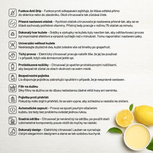 Šťava plná vitamínov jednoducho a rýchloZástancovia zdravého životného štýlu by vo svojej domácnosti nemali chýbať pomocník v podobe elektrického citrusovača Lauben Electric Citrus Juicer 110WT. Jeho čistý dizajn ozdobí každú kuchynskú linku, ktorú vďaka funkcii Anti Drip nepoškvrní ani kvapkou šťavy. Funkcia proti odkvapkávaniu zabezpečuje, že džús prúdi priamo do pohára alebo zostáva v zásobníku. Rýchlosť otáčok pri odšťavovaní je nastavená tak, aby si šťava uchovala maximum vitamínov. Chuť navyše nie je nijak ovplyvnená, pretože časti prichádzajúce do kontaktu s ovocím sú nerezové alebo z plastu splňujúceho najprísnejšie nariadenia EÚ a neuvoľňujú žiadnu pachuť ani arómu. Tvar kužeľa a nastaviteľná páka proces odšťavovania zefektívňujú a tichý chod umožňuje prípravu džúsu hocikedy. Bezpečný chod zabezpečujú protisklzové nožičky a poistka znemožňujúca spustenie, ak lis nie je riadne zostavený. Určite poteší aj ľahká údržba, odnímateľné časti stačí vložiť do umývačky.