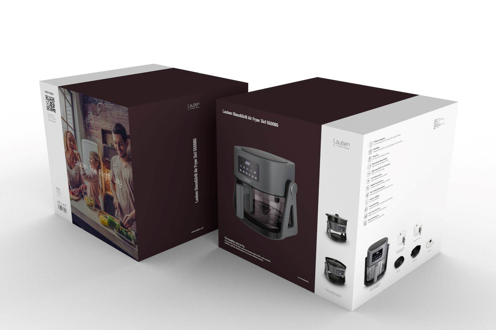 Zdravé varenie nebolo nikdy jednoduchšie a nemusíte sa vzdať ani obľúbených vyprážaných pochutín. Horkovzdušná fritovacia rúra s grilom Lauben Glass&Grill Air Fryer 3in1 5500BG prináša úplne novú dimenziu prípravy jedál využívajúcu až o 80 % menej tuku. Originálny sklenený kôš s viditeľnosťou 360° zabezpečuje ničím nerušenú chuť a arómu jedla, zároveň umožňuje jeho jednoduchú kontrolu počas prípravy, a to aj vďaka vnútornému osvetleniu. Varenie urýchľujú 6 prednastavených programov, no teplotu a čas je možné nastaviť aj manuálne na digitálnom dotykovom displeji. O rovnomerné prepečenie sa stará infračervené svetlo, pomocou otočnej hornej časti o 180° spolu s použitím priloženej grilovacej či hlbokej panvice získate viac možností prípravy. Fritovacia misa je chránená bezpečnostným krytom proti popáleniu, pachový filter zas chráni domácnosť pred nepríjemným zápachom. Čas ušetríte pri varení aj údržbe, príslušenstvo stačí len vložiť do umývačky. Praktické rady na použitie prináša video tutoriál.