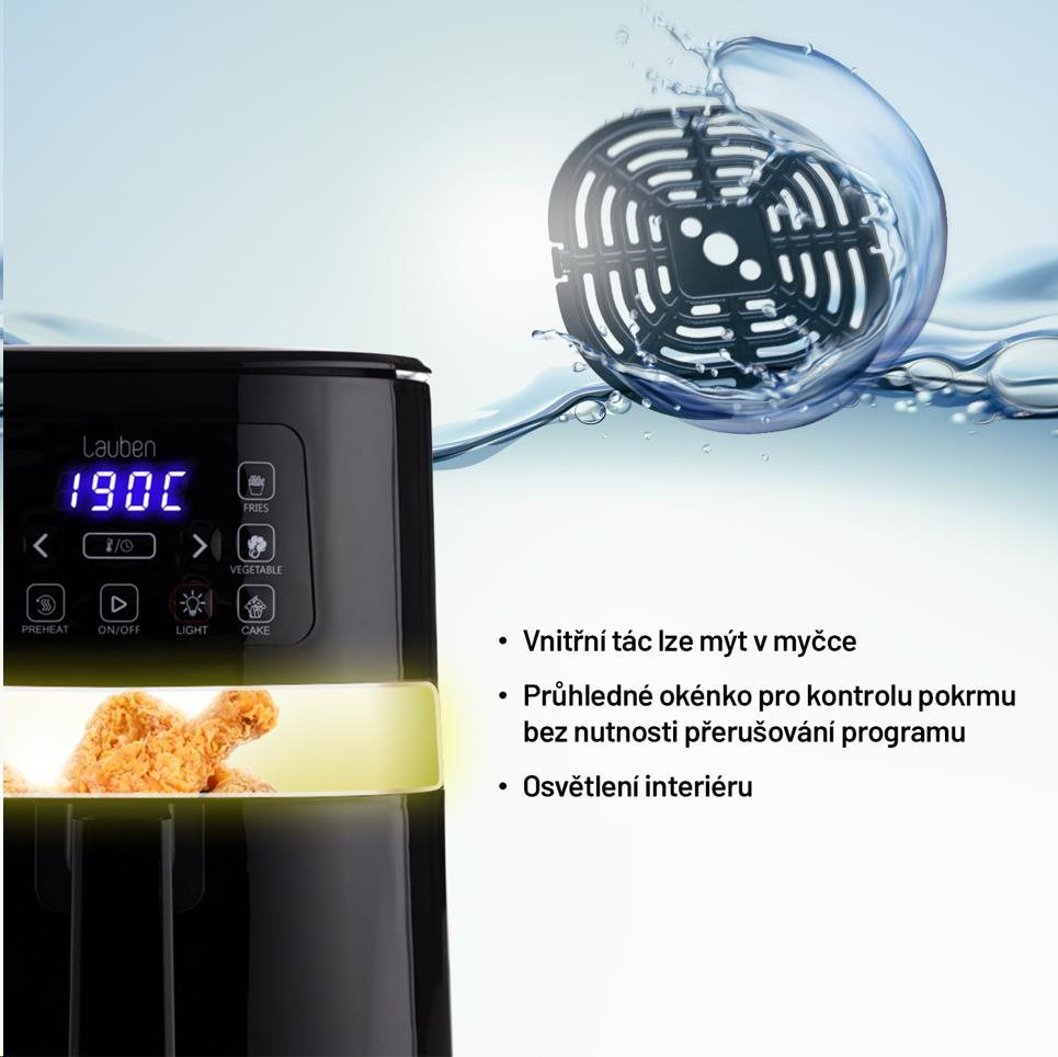 Ovládanie Lauben Air Fryer je intuitívne a zvládne ho každý. Požadovaný program si nastavíte pomocou tlačidiel a na displeji môžete kontrolovať teplotu a dobu prípravy. Vďaka priehľadnej časti fritézy a osvetleniu vnútra môžete pokrm ľahko skontrolovať aj vizuálne. Všetky komponenty, ktoré sa v priebehu prípravy jedla ušpinia, je možné umývať v umývačke riadu. Čerešničkou na torte je vkusný minimalistický dizajn, vďaka ktorému môžete fritézu bez obáv vystaviť na kuchynskú linku, i pokiaľ si potrpíte na estetickosť.
