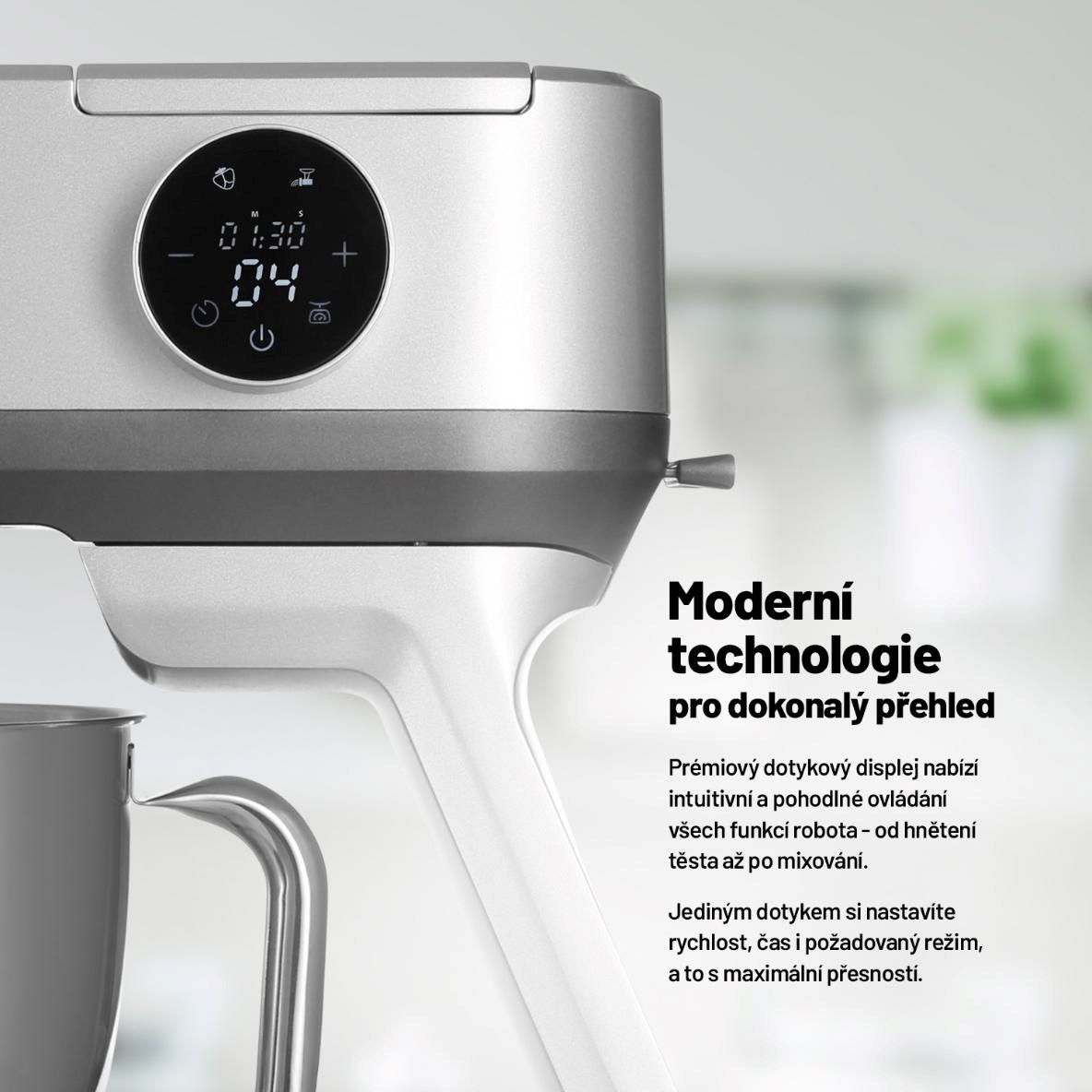 Kuchynského robota využijete nielen pri príprave cesta, ale jeho bohaté príslušenstvo umožňuje aj mixovať, strúhať či mlieť. V balení preto nájdete sklenený mixér, strúhadlo na zeleninu, mlynček na mäso či výrobník klobás a všetko príslušenstvo vymeníte veľmi ľahko pomocou zdvíhacieho ramena s pop-up systémom. Prostredníctvom prémiového dotykového displeja máte všetky procesy pod kontrolou, jednoducho nastavíte rýchlosť a všetko potrebné.