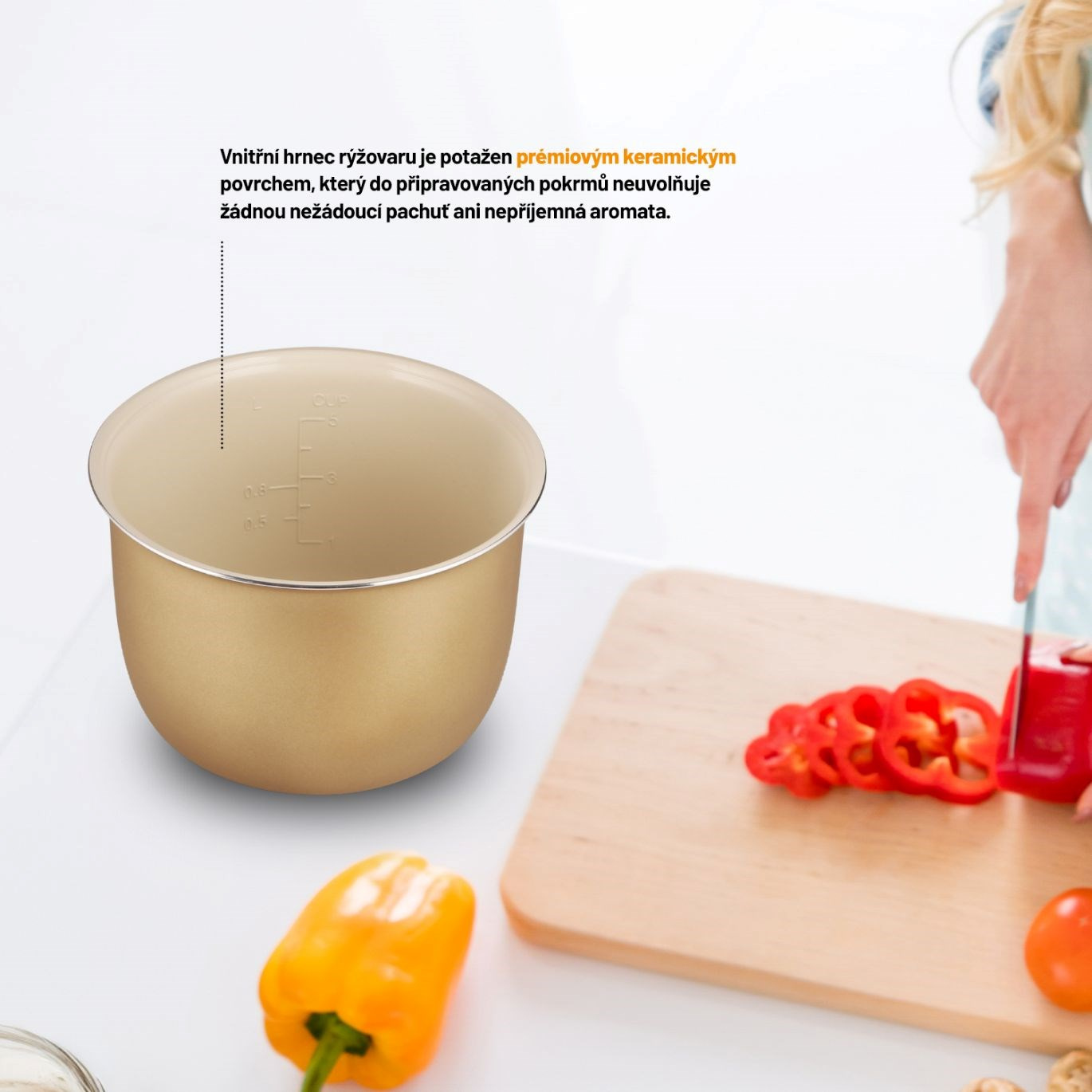 Užite si viac času na iné aktivity a varenie zverte viacúčelovému rýžovaru, ktorého 12 prednastavených programov si poradí s prípravou najrôznejších pokrmov. Programy ako ryža, "claypot" ryža, hnedá ryža, polievka, kaša, koláč, strukoviny, jogurt, kari, varenie v pare, dusenie či ohrievanie sú zárukou ľahkého a rýchleho varenia. Prémiový keramický povrch vnútorného hrnca navyše neuvoľňuje žiadnu nežiaducu chuť ani arómu, príprava jedál je tak zdravšia. Ak chcete svoj životný štýl ešte vylepšiť, využite nerezový parník na dusenie v pare.