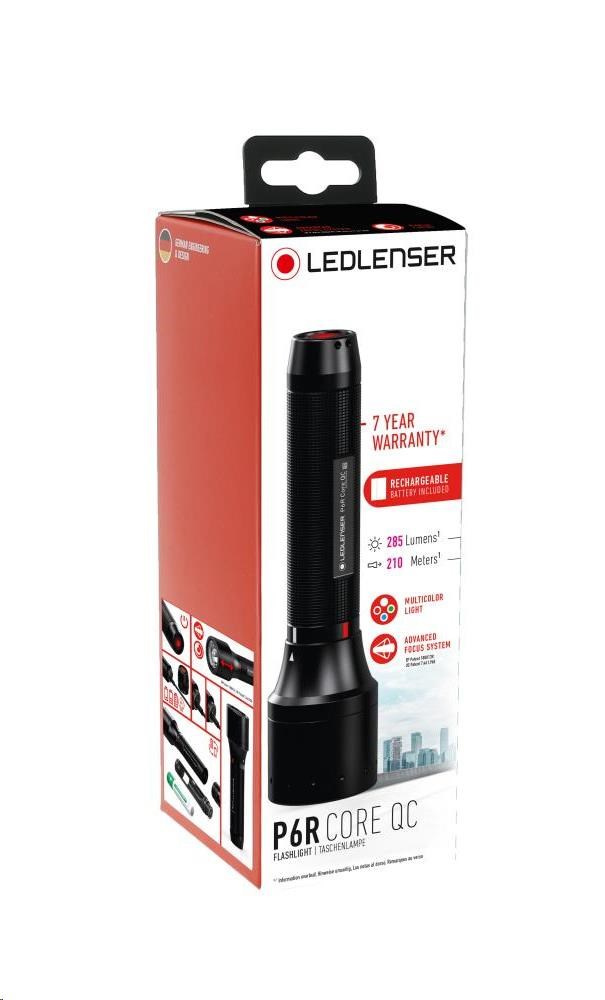 Kompaktná ručná čelovka LEDLENSER P6R QC je vybavená technológiou produkującou štyri rôzne farby svetla. Preto je obľúbená predovšetkým medzi lovcami, ktorí okrem klasického bieleho svetla (s výkonom až 270 lm) využijú aj červené svetlo (pre neoslňujúce nočné osvetlenie), zelené svetlo (na sledovanie zveri) a modré svetlo (pre dohľadávanie). Dobíjateľná batéria vydrží svietiť na jedno nabitie až 120 hodín. Čelovka je vybavená aj farebným stroboskopom a vďaka IP5 je odolná voči prachu a striekajúcej vode.