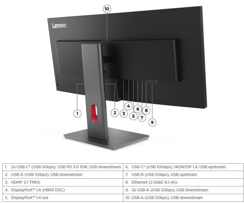 | Špeciálne funkcie | HDR10 Compliance Lenovo Accessories and Display Manager Lenovo Accessories and Display Manager podporuje Windows 10 & 11, Mac OS a Windows On Arm (funkcie sa líšia podľa systému). Lenovo Accessories and Display Manager je kedysi nazývaný Lenovo Display Control Center. LDFM (Lenovo Display Fleet Manager) Prírodné nízke modré svetlo Smart Power |