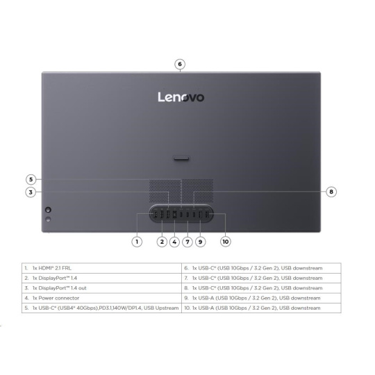 | USB porty | 1x USB-C® (USB 40Gbps / USB4®, PD 3.1 up to 140W, DP 1.4 Alt Mode HBR3, USB Upstream), 2x USB-A (USB 10Gbps / USB 3.2 Gen 2, USB Downstream), 3x USB-C (USB 10Gbps / USB 3.2 Gen 2, USB Downstream) |
