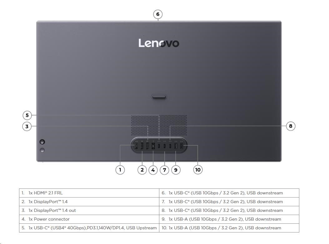 | USB porty | 1x USB-C® (USB 40Gbps / USB4®, PD 3.1 up to 140W, DP 1.4 Alt Mode HBR3, USB Upstream), 2x USB-A (USB 10Gbps / USB 3.2 Gen 2, USB Downstream), 3x USB-C (USB 10Gbps / USB 3.2 Gen 2, USB Downstream) |