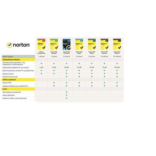 Norton 360 Standard poskytuje komplexnú ochranu pred malwareom pre jeden počítač PC, počítač Mac, zariadenie so systémom Android alebo iOS a funkciu zálohovania do cloudu pre počítač PC, čo pomáha zabrániť strate dát kvôli ransomwaru alebo zlyhaniu pevného disku, a správcu hesiel pre ukladanie a správu vašich hesiel. Norton 360 Standard tiež obsahuje funkciu ochrana siete VPN, ktorá vám umožňuje bezpečnejšie a anonymnejšie prehliadanie webu, a to aj vo verejných sieťach Wi-Fi a aplikáciu ochrana kamery pred zneužitím pre počítače PC.