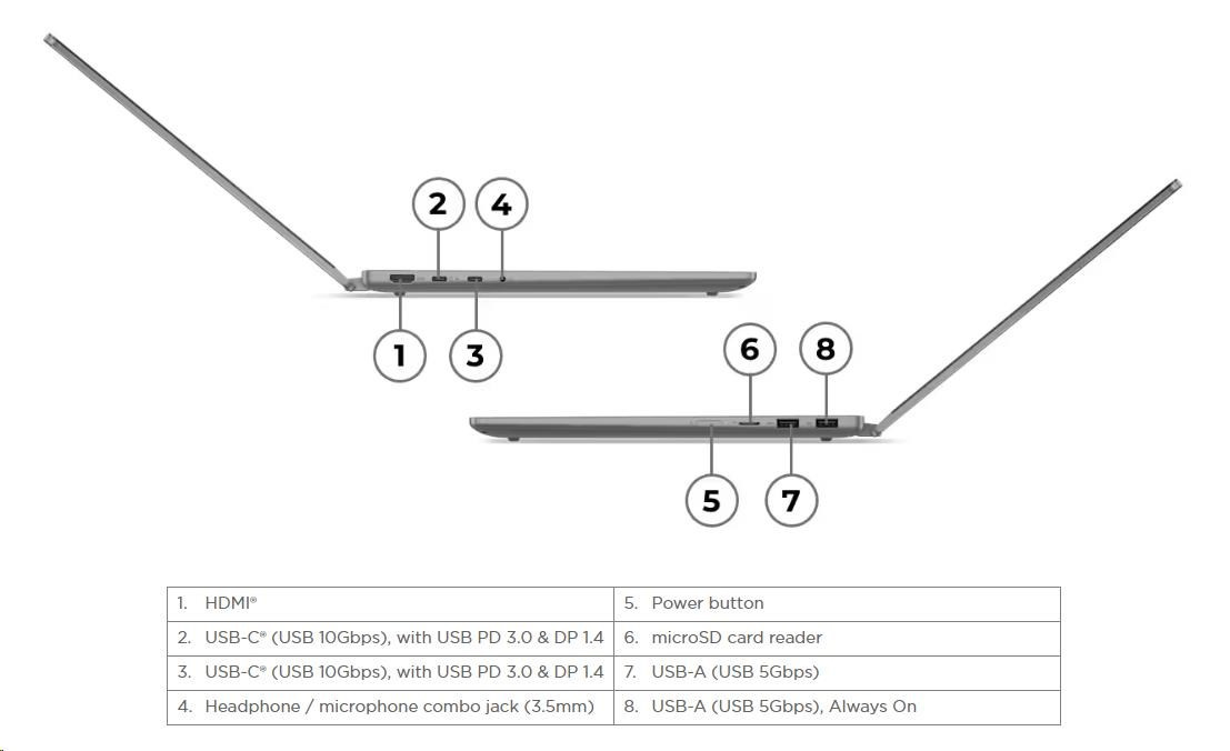 | Standartné porty | 1x USB-A (USB 5Gbps / USB 3.2 Gen 1) 1x USB-A (USB 5Gbps / USB 3.2 Gen 1), Always On 2x USB-C® (USB 10Gbps / USB 3.2 Gen 2), with USB PD 3.1 and DisplayPort™ 1.4 1x HDMI® 1.4b 1x Headphone / microphone combo jack (3.5mm) 1x microSD card reader |