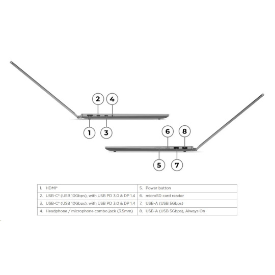 | Standartné porty | 1x USB-A (USB 5Gbps / USB 3.2 Gen 1) 1x USB-A (USB 5Gbps / USB 3.2 Gen 1), Always On 2x USB-C® (USB 10Gbps / USB 3.2 Gen 2), with USB PD 3.0 and DisplayPort™ 1.4 1x HDMI® 2.1, up to 4K/60Hz 1x Headphone / microphone combo jack (3.5mm) 1x microSD card reader |