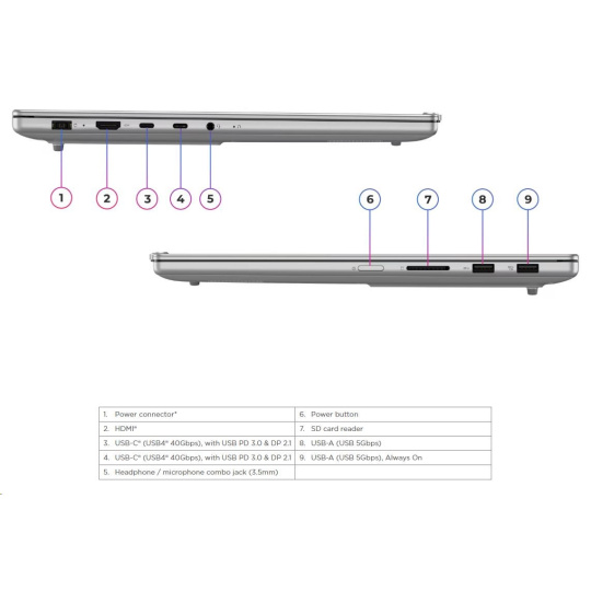 | Standartné porty | 1x USB-A (USB 5Gbps / USB 3.2 Gen 1) 1x USB-A (USB 5Gbps / USB 3.2 Gen 1), Always On 2x USB-C® (USB4® 40Gbps), with USB PD 3.0 and DisplayPort™ 2.1 1x HDMI® 2.1, up to 8K/60Hz 1x Headphone / microphone combo jack (3.5mm) 1x SD card reader 1x Power Connector |