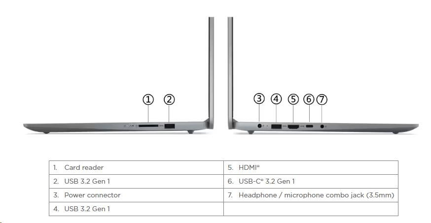Standartné porty | 2x USB 3.2 Gen 1 1x USB-C® 3.2 Gen 1 (support data transfer, Power Delivery and DisplayPort™ 1.2) 1x HDMI® 1.4 1x Headphone / microphone combo jack (3.5mm) 1x Card reader 1x Power connector |