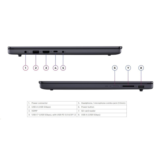 | Standartné porty | 2x USB-A (USB 5Gbps / USB 3.2 Gen 1) 1x USB-C® (USB 5Gbps / USB 3.2 Gen 1), with USB PD 3.0 and DisplayPort™ 1.2 1x HDMI® 1.4 1x Headphone / microphone combo jack (3.5mm) 1x SD card reader 1x Power connector |