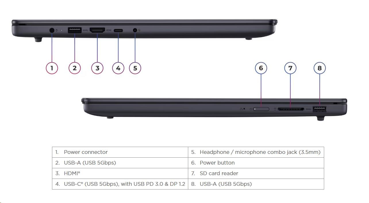 | Standartné porty | 2x USB-A (USB 5Gbps / USB 3.2 Gen 1) 1x USB-C® (USB 5Gbps / USB 3.2 Gen 1), with USB PD 3.0 and DisplayPort™ 1.2 1x HDMI® 1.4 1x Headphone / microphone combo jack (3.5mm) 1x SD card reader 1x Power connector |